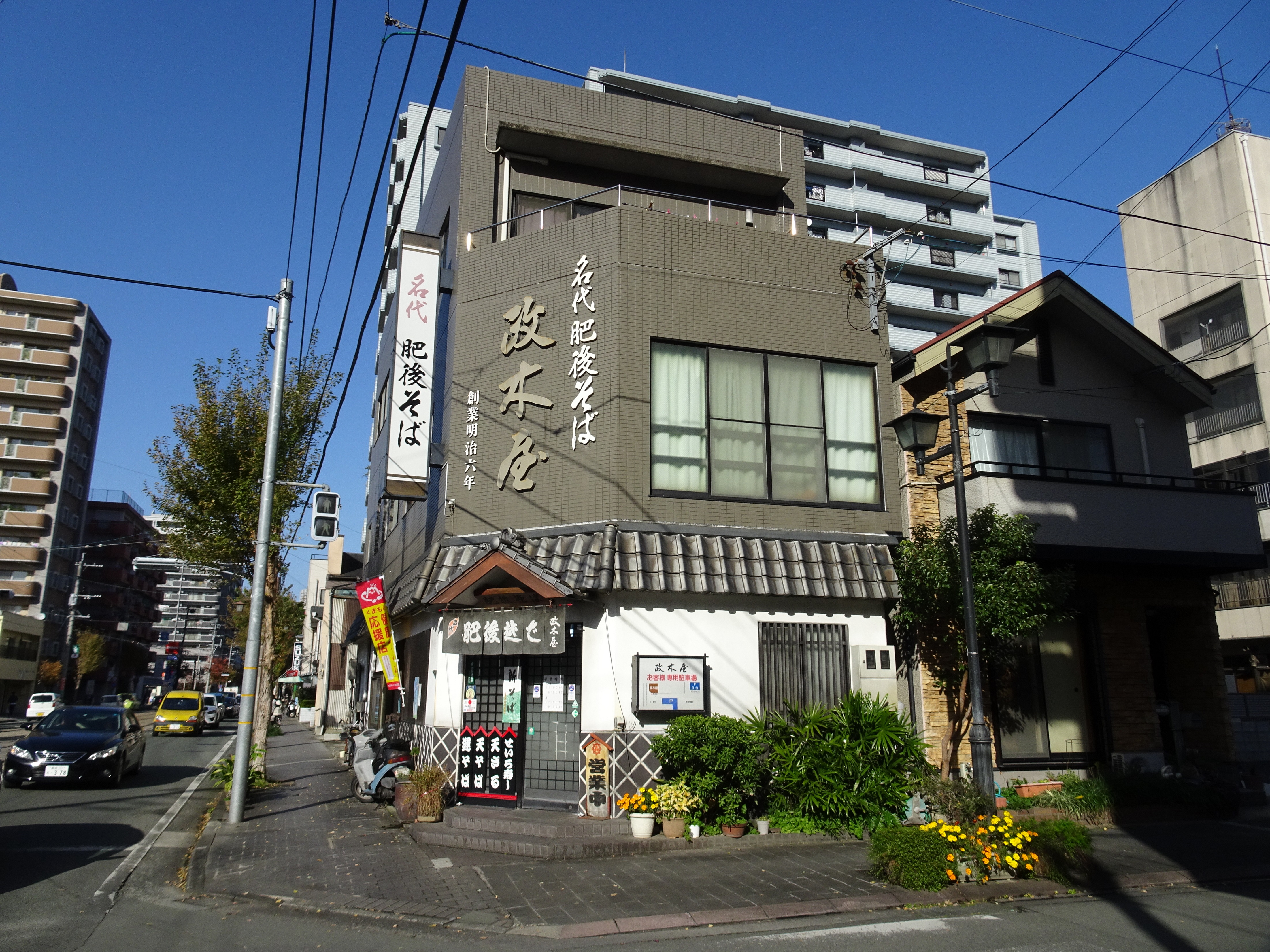 熊本において、先月号で紹介した『肥後名代手打 生蕎麦 井上』に次ぐ歴史を有する『名代肥後そば 政木屋』は、1873(明治6)年創業、そば店を始める前は染物業などを営んでいたというから、商家としての歴史はさらに古い。主な顧客は武士だったが、明治維新をきっかけとして、5代目・正木讓さんの高祖母・正木喜登さんが得意のそば打ちを活かしてそば店を開業したのがそば店としての歴史の始まりだ。